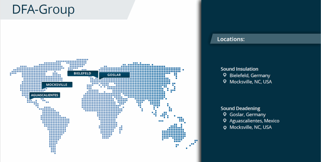 DFA US, Inc. is a private owned European business that expanded to the United States in 2015. We manufacture sound insulation and dampening for specific automotive clients. With our recent expansion we have opened our facility to working with markets outside of the automotive industry. To learn more about who our sister companies produce for please visit Customers (dfa-gmbh.com).